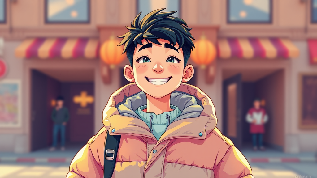 A vibrant, animated illustration of a young, cheerful man dressed in a poncho-style oversized puffer jacket, reminiscent of Off-White fashion with a touch of Tumblr aesthetics. Inspired by Yanjun Cheng, the artwork captures a lofi internet meme vibe suitable for trending on Dezeen. Rendered in a 3D style echoing the creativity of Beeple, Rhads, and Lois van Baarle, the image showcases the cartoonish appeal with bright, bold colors and a retro anime flair. This captivating illustration presents a unique blend of modern digital art and nostalgic charm in a 2:3 aspect ratio.