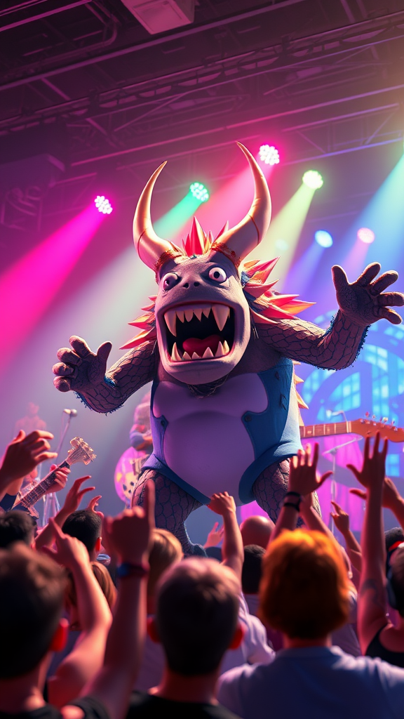 A vibrant animation key shot captures a lively band behemoth performing energetically on stage, surrounded by an enthusiastic crowd. The scene, reminiscent of Studio Ghibli, Pixar, and Disney animation styles, showcases a 3D rendering with intricate detail. Sharp and vivid, the image is rendered in Unreal Engine 5, highlighting the behemoth's expressive features and dynamic movements. Inspired by anime key art techniques, the shot is infused with the dramatic lighting and bloom effects typical of Greg Rutkowski's work. The atmosphere is electric, colorful stage lights casting dramatic shadows while capturing the whimsical essence of an animated musical performance.
