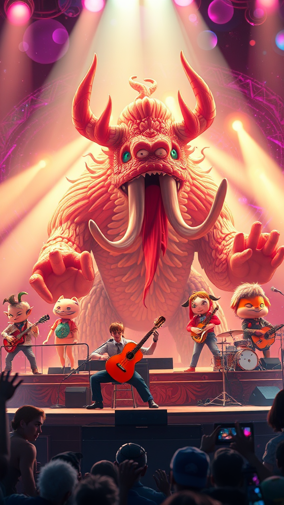A vibrant animation key shot capturing a colossal band behemoth in mid-performance on a grand stage, the scene bursting with energy as vivid colors and dynamic lighting illuminate the moment. The behemoth, a captivating fusion of whimsicality and grandeur, is rendered in stunning 3D detail reminiscent of Studio Ghibli and Pixar, with a touch of Disney charm. Each creature in the behemoth’s ensemble wields a unique instrument, their harmonized efforts creating a symphony that seems to resonate through the screen. Rendered in Unreal Engine 5, the scene boasts sharp, lifelike textures and an anime-inspired key art style, influenced by the distinct touch of Greg Rutkowski. The atmosphere is enriched with dramatic bloom effects, casting an ethereal glow across the stage, highlighting the band's exuberant expressions and intricate costumes, inviting viewers into a world where fantasy meets musical enchantment.