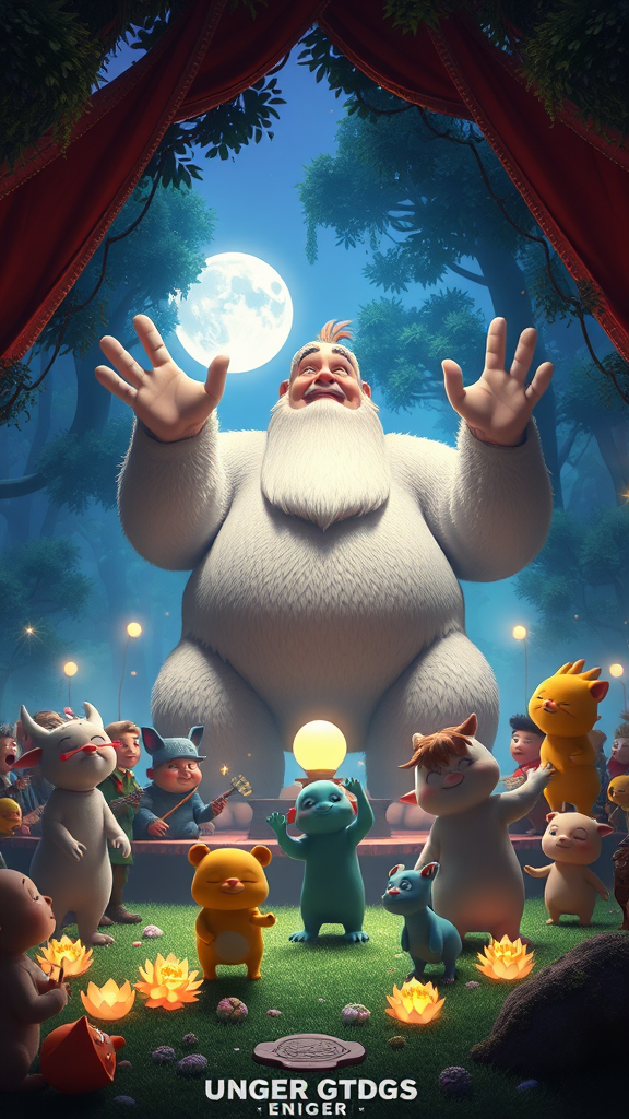 A vibrant animation key shot featuring a colossal, gentle giant performing energetically on stage, surrounded by an ensemble of whimsical, smaller creatures playing various instruments. The scene is captured in a medium shot, showcasing a harmonious blend of Studio Ghibli's charm, Pixar's character appeal, and Disney's enchanting details, rendered in stunning 3D with Unreal Engine 5. The atmosphere is imbued with Greg Rutkowski's signature anime-inspired key art, adorned with ethereal bloom effects and dramatic, dynamic lighting that highlights the textures and expressions. The stage is a mystical forest clearing, with glowing mystical plants and softly illuminated by the moon, creating a magical and heartwarming ambiance.