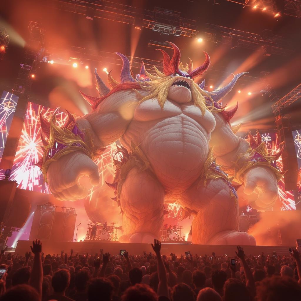 A vibrant animation key shot of a colossal band behemoth passionately performing under the dazzling stage lights, with expressive features and dynamic poses, the scene captures the essence of a fantasy rock concert. The medium shot showcases the grandeur of the stage, bathed in a warm, ethereal glow reminiscent of Studio Ghibli, Pixar, and Disney's magical worlds. The 3D rendering in Unreal Engine 5 brings depth and realism, with a focus on sharp, intricate details. The atmosphere is infused with anime-inspired key art influences by Greg Rutkowski, featuring dramatic lighting and a gentle bloom that highlights the energy and emotion of the moment.