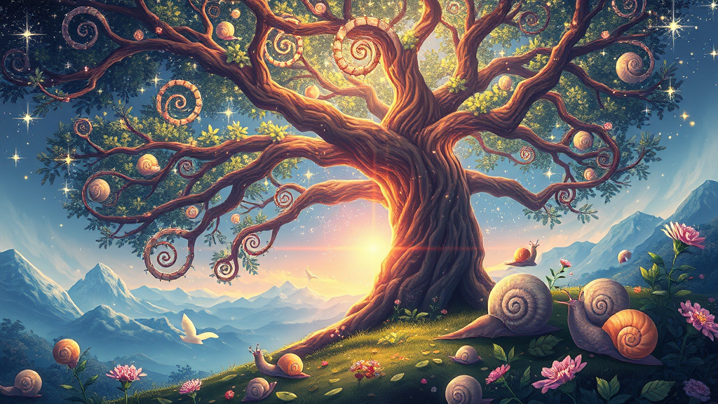 A vibrant anime style artwork depicting a mystical tree at its heart filled with twinkling stars, showcasing a blend of luminous landscapes and richly detailed art nouveau elements, capturing the essence of pristine naturalism with a touch of snailcore charm. The scene is bathed in ethereal light, evoking a sense of wonder as it intertwines with a D&D fantasy setting, where spiraling snail shells and intricate foliage converge in a harmonious dance of nature.