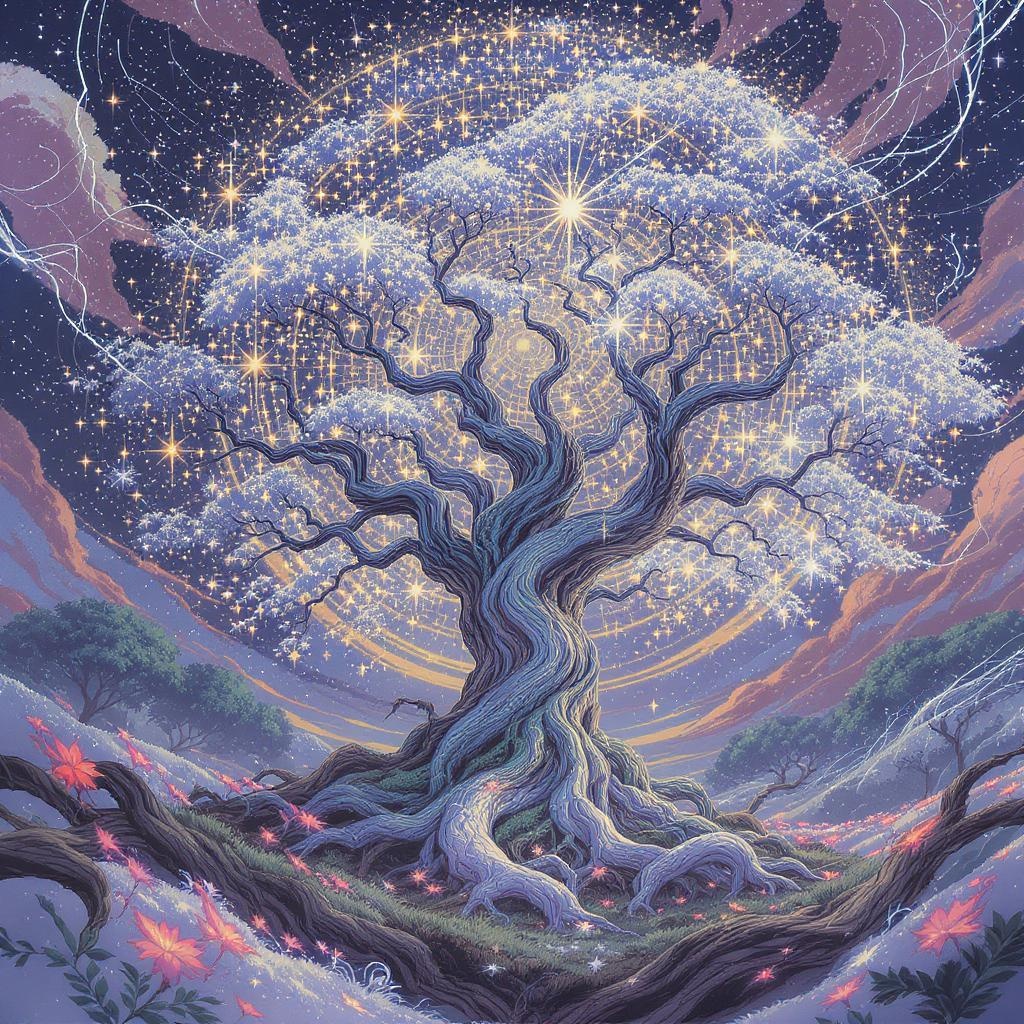 A vibrant anime-style artwork featuring a sprawling tree at its heart, its branches cradling a myriad of twinkling stars. The scene is imbued with a sense of luminous landscapes, merging art nouveau's intricate detailing with pristine naturalism. Delicately swirling motifs encapsulate the essence of snailcore and medieval D&D aesthetics, with light dancing through the leaves, casting ethereal patterns on the forest floor. The air shimmers with magic, the twilight sky a canvas of soft hues, inviting viewers to explore this enchanting, otherworldly realm.
