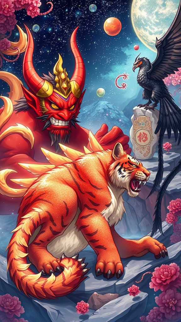 A vibrant anime-style illustration featuring a kitsuné with shimmering fur and multiple tails, surrounded by an aura of mystical energy. The scene includes an imposing Oni with red skin and gilded armor, exuding an air of power and mischief. A Nué with a richly detailed tiger body and a long, reptilian tail lounges nearby, its eyes full of ancient wisdom. A Tengu with striking black wings and a sharp beak stands atop a rocky outcrop, observing the scene with intense focus. Around them is a whimsical array of intricately designed funji decor, casting an ethereal glow over the scene. The artwork is rendered in HD, 2K resolution, with an extraordinary level of detail in the character designs and background, bringing this fantastical world to life.