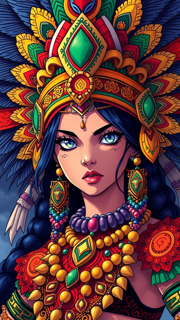 A vibrant anime-style portrait of an Aztec princess adorned with a majestic Moctezuma's headdress, featuring intricate patterns and vivid colors like those seen in Studio Ghibli films. The illustration captures the dynamic energy and expressive style reminiscent of JoJo's Bizarre Adventure, showcasing the princess with an intense inner light. Her eyes shine with determination, and her regal attire is depicted with highly detailed embellishments, blending traditional Aztec elements with a modern artistic flair. The artwork bursts with astonishing detail and action, creating a striking and unforgettable image.
