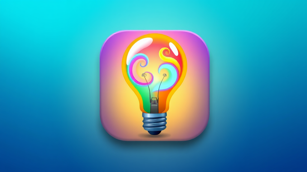 A vibrant app icon featuring a glowing, stylized light bulb with whimsical swirls of color within its glass, set against a soft gradient background that transitions from deep blue to light teal.