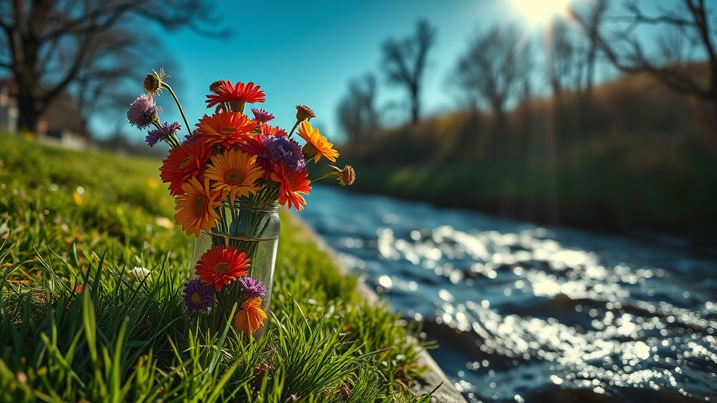 A vibrant arrangement of colorful flowers encased within a glass bottle on lush grass, illuminated by breaking light under a clear blue spring sky. The scene is highly detailed and in sharp focus, presenting a professional and cinematic 8k UHD quality. A dark, restless river flows nearby, adding a dramatic and intense atmosphere. The image evokes a blend of beauty and nervousness, skillfully rendered with HDR CGI effects. Despite hints of low resolution and imperfections, such as jpeg artifacts and minor blurs, the composition captivates with its surreal, almost dreamlike quality.