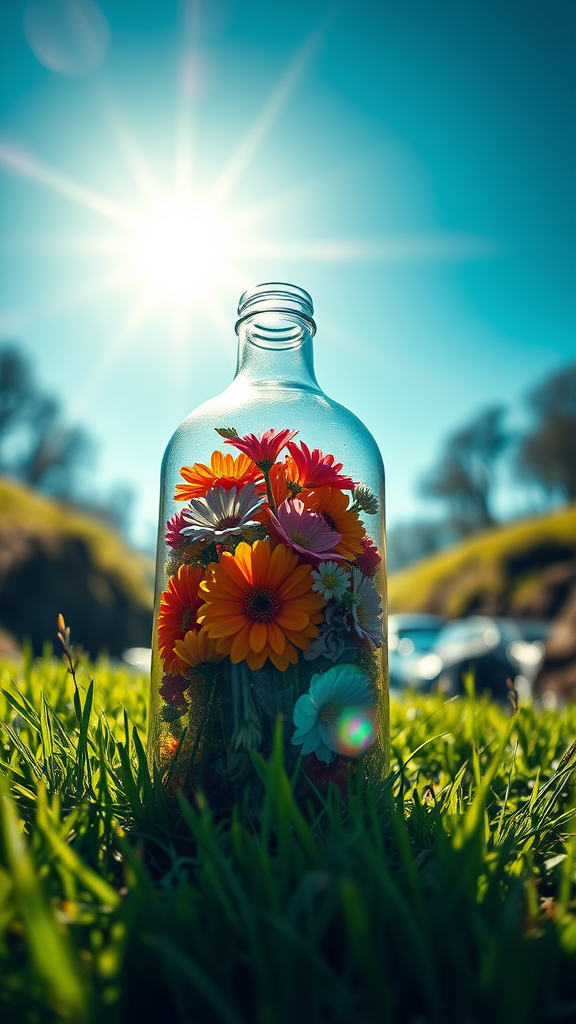 A vibrant array of colorful flowers encapsulated within a clear glass bottle sits gracefully on lush green grass under the radiant spring sun. The light refracts beautifully, creating a kaleidoscope of hues against a backdrop of a clear blue sky. This highly detailed, cinematic 8k UHD imagery captures the serenity and vitality of nature. Though the scene feels peaceful, a dark, restless river runs nearby, infusing a dramatic tension into the atmosphere. The overall mood oscillates between calm and nervous, as though a story is about to unfold. The render is striking with HDR CGI quality, evoking an intense emotional response through its photorealism and attention to detail. In stark contrast, elements of the scene are tinged with surreal distortions—blurry edges, slight deformations, and unexpected anomalies hint at an underlying imperfection. The eerie juxtaposition between beauty and unease lingers, leaving a lasting impression without the distractions of watermarks or artificial enhancements.