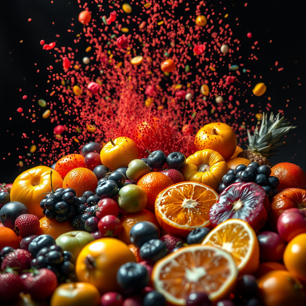 A vibrant array of vividly hued fruits, bursting with exaggerated contrast and intricate details, erupts into a shower of particles against a shadowy backdrop. The scene features a pronounced depth of field, showcasing a dazzling spectrum of complementary colors with a cinematic grain. The composition is hyperrealistic and masterfully crafted, bathed in gentle light to enhance its breathtaking beauty.