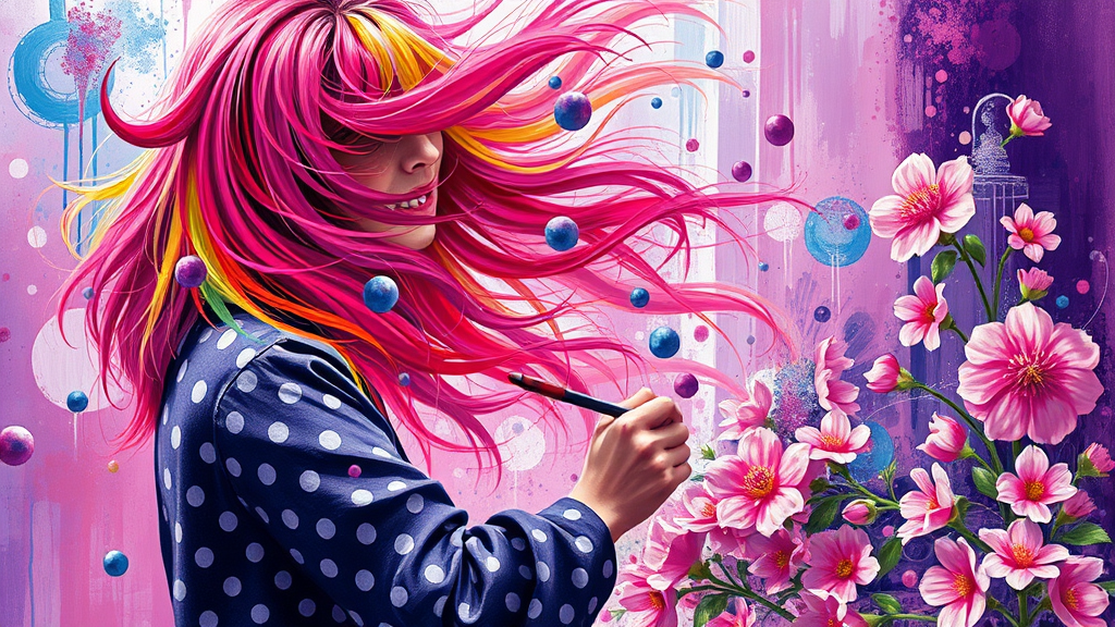 A vibrant artist passionately crafting an abstract masterpiece, their colorful hair reminiscent of a flowing rainbow, in the style of Kazuo Oga. The scene is infused with playful polka dots and blooming flowers, dominated by hues of purple and pink. The artistic influence is evident in the lively brushstrokes and dynamic composition, captured in ultra-high definition and sharp focus, every detail meticulously rendered to convey the creative explosion in a harmonious blend of colors and forms.