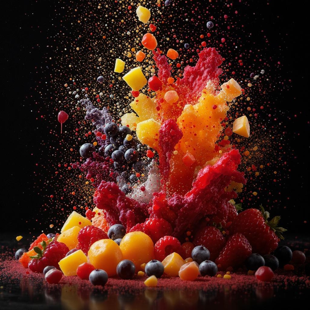 A vibrant assortment of richly hued fruits bursts dramatically, sending a cascade of vivid particles into the air. The scene is set against a deep, shadowy backdrop that accentuates the intensity of the colors. The composition features extreme contrast and exquisite detail, enhanced by a powerful depth of field that draws the viewer into this hyperrealistic spectacle. Complementary colors dance in a symphony of visual harmony, while a subtle film grain overlay adds a touch of nostalgic texture. Bathed in soft, gentle light, the aesthetic is both stunningly beautiful and a testament to the mastery of detail.