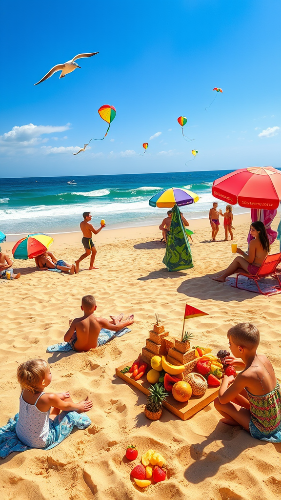 A vibrant beach scene brimming with joy and color unfolds as a group of friends revels in a sun-drenched day by the ocean. The golden sand is dotted with vibrant beach umbrellas and whimsically designed towels, some decorated with palm trees and sea creatures. Laughter fills the air as some friends engage in a spirited game of beach volleyball, their silhouettes framed by the gentle arc of a gliding seagull. Others unleash colorful kites into the azure sky, each swooping and twirling with the soft sea breeze. A few friends relax on beach chairs, sipping on icy lemonade and coconut water while munching on an assortment of fresh fruits laid out on a nearby snack table, featuring juicy watermelon slices, pineapple chunks, and an array of berries. Kids nearby are engrossed in building an elaborate sandcastle, complete with towers and seaweed flags fluttering gently. The ocean's waves create a soothing backdrop, lapping rhythmically against the shore as sunlight dances across the water in sparkling patterns. It is a picture-perfect day, where friendships are celebrated amidst the enchanting symphony of nature.