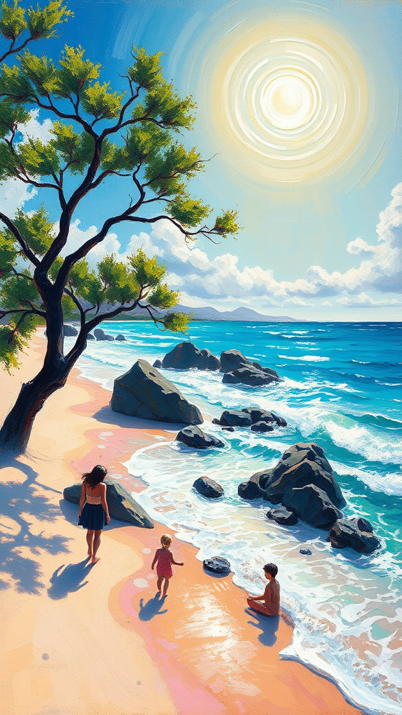 A vibrant beach scene unfolds under a dazzling sun, where gentle waves kiss the shoreline with a rhythmic melody. Impressionism style breathes life into this tableau, as brushstrokes swirl and dance across the canvas like a soft ocean breeze. The influence of Claude Monet and Pierre-Auguste Renoir can be felt in the delicate play of light and shadow, embracing an array of bright, pastel colors that blur into one another with a dreamlike quality. In the foreground, figures are suggested rather than defined, their forms flowing with an ethereal grace that hints at both movement and stillness. A curious edge is introduced, inspired by Andrew Atroshenko, where certain elements take on a subtly grotesque twist—tree branches contort with an eerie elegance, rocks along the shoreline appear slightly deformed, their shapes whispering tales of the ocean’s mystery. The scene captivates with its balance of beauty and the uncanny, inviting onlookers to delve deeper into its enchanting and enigmatic ambiance.