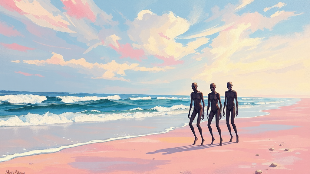 A vibrant beach scene unfolds under a pastel sky with shimmering, iridescent hues. The ocean laps against the shore with loose, sweeping brushstrokes adeptly capturing the movement and fluidity of the water, reminiscent of Monet and Renoir's approach to light and motion. The sand is dappled with soft pinks and purples, playing beautifully with the palette of the Impressionists. Despite the serene beauty, there lurks an unsettling atmosphere; figures are subtly distorted, with elongated limbs and twisted forms suggesting a sense of mutation. Their faces are barely defined, with hollow eyes that gaze vacantly, adding an eerie undertone. The scene melds beauty with the slightly bizarre, captivating with its dreamlike quality while hinting at the grotesque, a nod to the influence of Andrew Atroshenko's abstracted, unconventional figures. The result is a hauntingly beautiful landscape, merging the grace of Impressionism with an eerie, otherworldly flair.