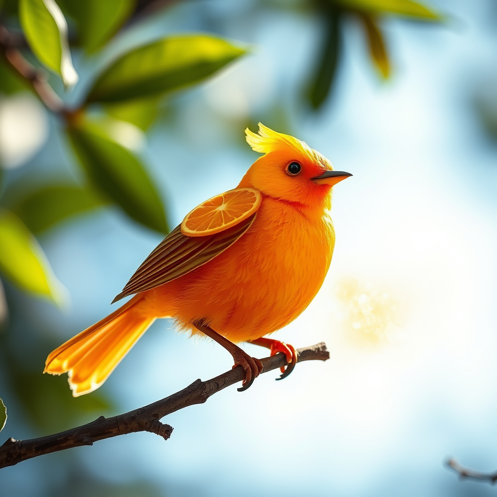 A vibrant bird crafted from a freshly sliced orange, showcasing the rich, juicy texture of the fruit combined with fine feather detailing; perched on a sunlit branch, with the translucent zest catching the light, soft shadows add depth to the scene, photo-realistic techniques with an artistic flair.