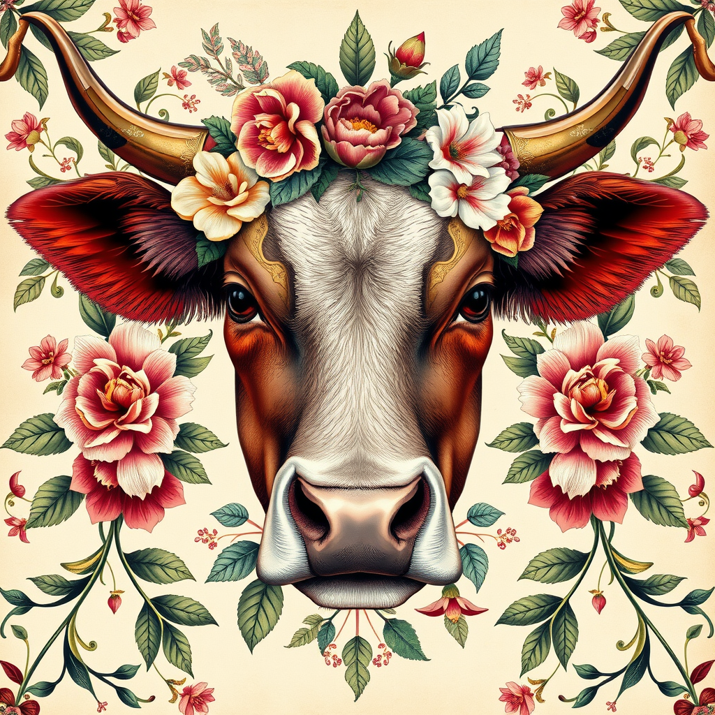 A vibrant botanical steampunk illustration featuring a realistic cow face with symmetrical features, in the style of William Morris. The design incorporates intricate floral motifs set against a Victorian background, showcasing elegant and highly detailed floral elements and leaves. The cow's visage is intertwined with shiny metal and mechanical components, giving it a three-dimensional and polished appearance. Elements of a mace are subtly integrated into the design, enhancing the steampunk aesthetic, while ensuring the overall composition remains visually compelling and meticulously detailed.