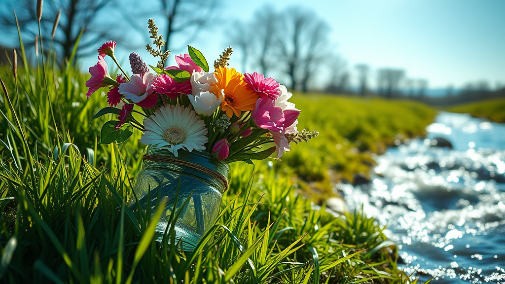 A vibrant bouquet of flowers contained within a clear glass bottle rests gracefully on the lush green grass. Sunlight dances through, casting playful reflections, under a brilliant blue spring sky. The scene is captured in exquisite detail, with sharp focus and a professional touch, evoking a cinematic feel in 8k UHD. Surrounding elements offer a dramatic contrast, featuring a swiftly flowing river that injects an underlying tension. The atmosphere is rendered with a sense of nervous energy, blending high dynamic range CGI and 3D elements. Despite the serene setting, there's a hint of darkness subtly woven into the narrative, providing depth and intrigue. The composition steers clear of imperfections, maintaining realistic anatomy and proportions, devoid of any distortions or anomalies that could disrupt the visual harmony. The image is pristine and free of any unwelcome text overlays, errors, or artifacts that might mar its quality.