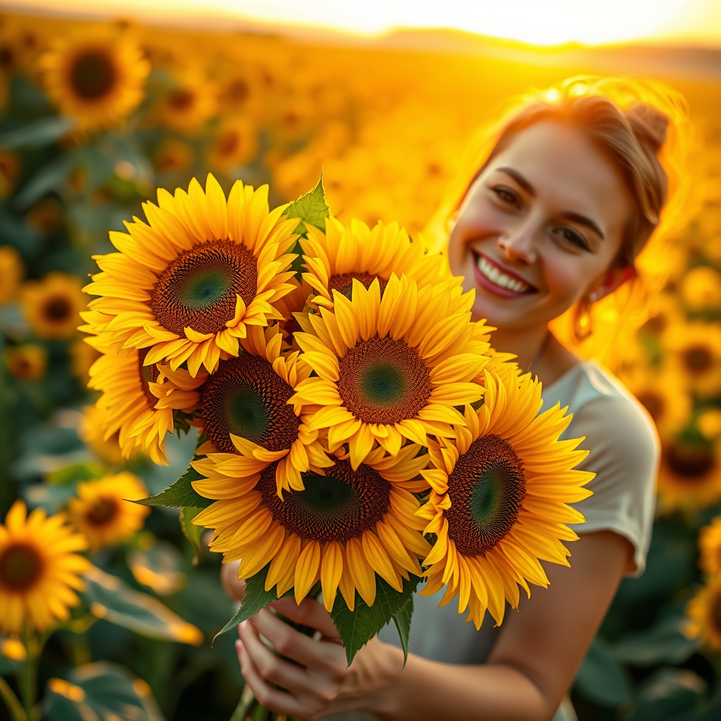 A vibrant bouquet of sunflowers held by a smiling individual, set against an expansive field of towering sunflowers stretching to the horizon under a warm golden sunset. The focus is sharp on the bouquet with a dreamy, blurred background, giving a sense of depth and immersion. Each sunflower is depicted with meticulous detail, capturing their intricate patterns and rich textures. The image is bathed in soft, cinematic lighting that highlights the natural beauty of the scene, achieving a hyper-realistic quality.