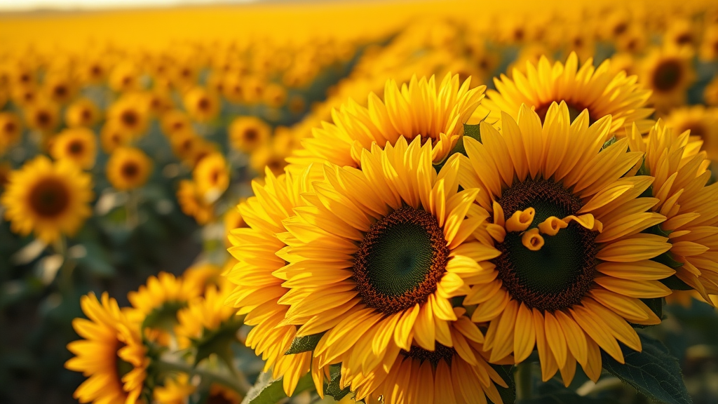 A vibrant bouquet of sunflowers takes center stage, captured with a shallow depth of field that blurs the edges into a sea of golden petals. In the background, an expansive sunflower field stretches beyond the horizon, each flower nodding gently in the breeze. The scene is bathed in cinematic, warm lighting, casting soft shadows that enhance the intricate details of the bouquet. The photograph is so finely detailed and hyper-realistic, it feels as if the viewer could reach out and touch the velvety petals. This masterpiece composition evokes the essence of a sun-drenched day, capturing nature's brilliance in 8K resolution.