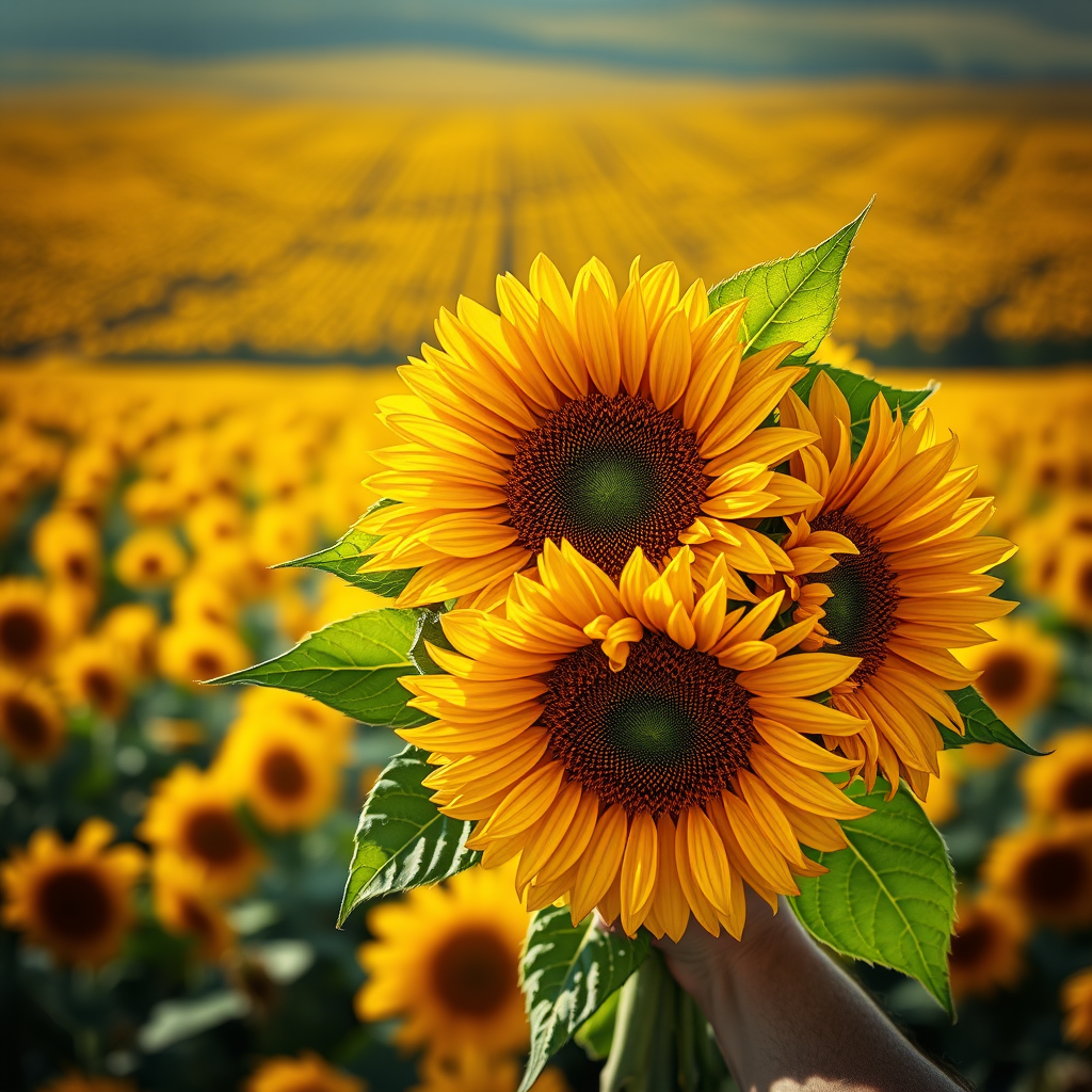 A vibrant bouquet of sunflowers with golden petals and rich green leaves held close, set against a sprawling and vivid sunflower field stretching into the distance, captured with a shallow depth of field in portrait orientation. The scene is illuminated with dramatic, cinematic lighting that casts dynamic shadows, enhancing the intricate details of each sunflower. The hyper-realistic composition is visually striking, with 8K resolution capturing every nuance of texture and color, transforming the image into a breathtaking masterpiece.