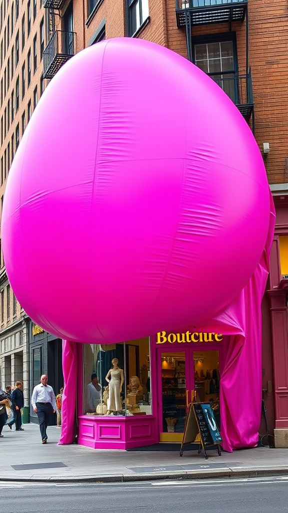A vibrant})(); boutique on a bustling New York City street, its bright pink silk facade inflated like a balloon, distended to comical proportions, the usually decorous storefront now resembling a whimsical, oversized cartoon.