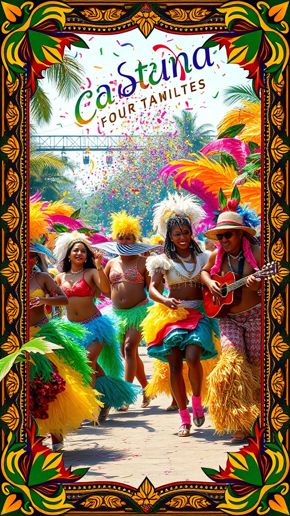A vibrant Brazilian carnival celebration scene featuring dancers adorned in colorful costumes, with feathers and sequins, set against a lively background. The image is framed by intricate decorative borders inspired by Brazilian patterns, highlighting the festive spirit. A sense of motion and joy is conveyed as confetti floats through the air and musicians play energetic samba rhythms. The setting is infused with tropical elements and bright hues that capture the essence of this cultural extravaganza, with an elongated, dynamic composition that enhances the grandeur of the festivities.