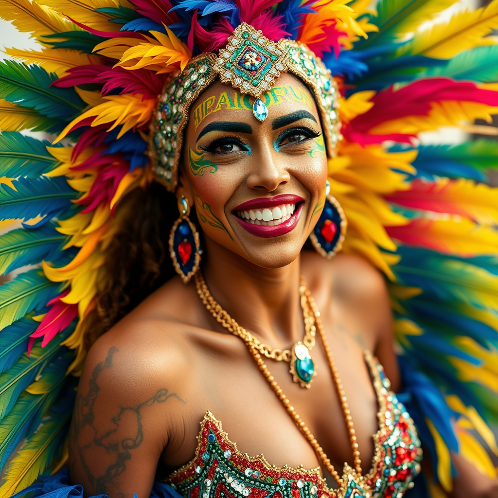 A vibrant Brazilian woman in a dazzling carnival costume, her skin adorned with intricate patterns of bright feathers and shimmering sequins, radiating an infectious spirit of energy and exuberance. The scene captures her joyful essence, as she becomes a living embodiment of celebration and culture.