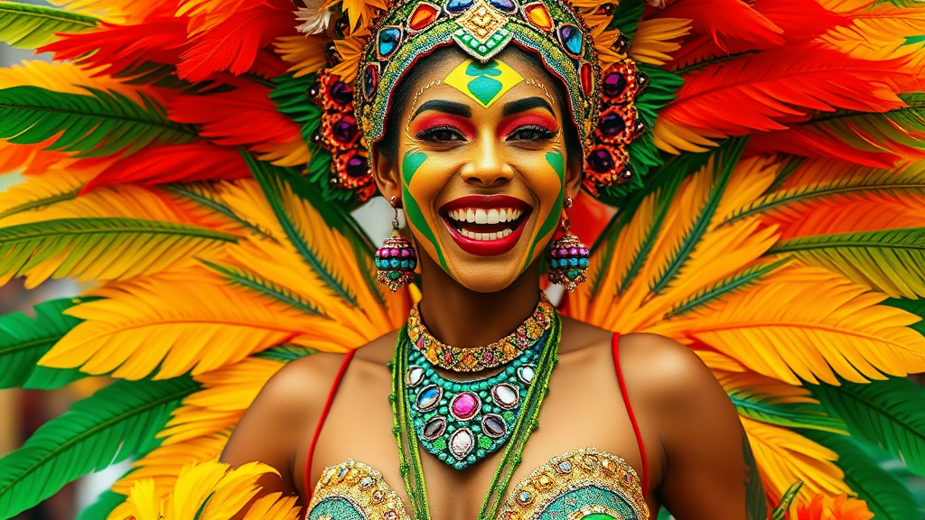 A vibrant Brazilian woman in a dazzling carnival ensemble, adorned with bright, feathered body paint and shimmering sequins, radiating infectious joy and vivacity. She captivates with her dynamic presence and exuberant spirit, embodying the lively essence of the festival. Her costume features an array of vivid colors and intricate designs that celebrate the rich culture and festive atmosphere. Her enthusiasm is palpable, inviting others to join in the celebration of life and joy.