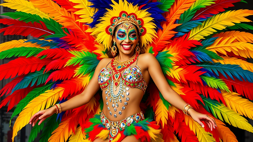 A vibrant Brazilian woman radiates joy and energy in her dazzling carnival ensemble, adorned with an explosion of bright, feathered body paint and sparkling sequins. Her costume boasts a kaleidoscope of colors, capturing the festive spirit and rhythm of Brazil's famous Carnival. Her expressive dance conveys a whirlwind of cultural celebration, while the intricate details of her attire highlight the artistry and creativity of the festival. As she moves, the feathers and sequins shimmer, enhancing her exuberant presence and living embodiment of the Carnival's cheerful atmosphere.