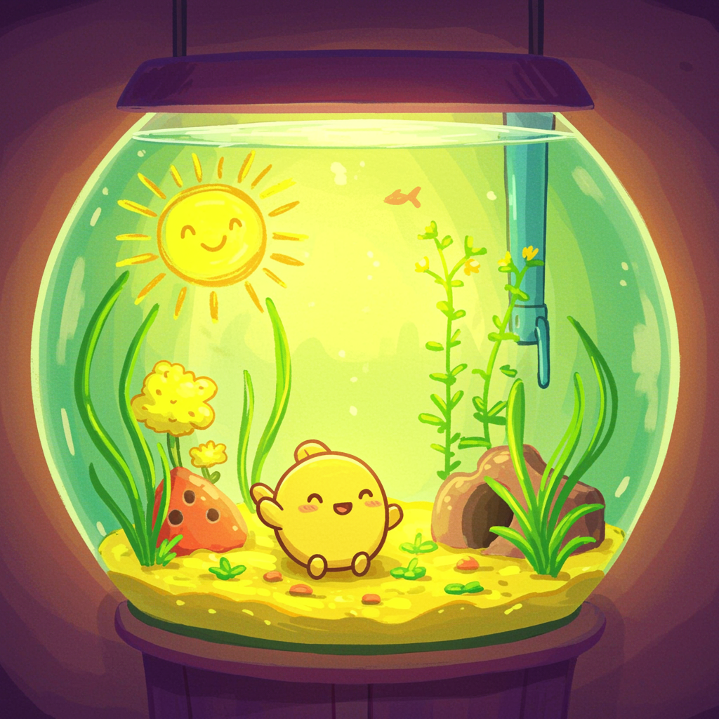 A vibrant, cartoon-colored rounded aquarium featuring an adorable character basking in the bright, sunny ambiance. The scene bursts with primary colors, especially yellow and green, reminiscent of a child's joyful crayon drawing. The overall design embraces uniqueness and creativity, avoiding uniformity and replicating nature's beautiful imperfections.