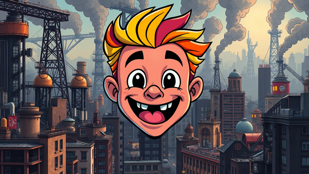 A vibrant cartoon face, alive with a spectrum of colors, emerges from a bustling cityscape. The backdrop features intricate industrial forms teeming with hidden details, echoing Tim Doyle's distinct style. The setting, darkly detailed, juxtaposes the solarizing mastery of an Agustín Fernández and the boldness of poster art. The composition, uniquely stylized, invites viewers to explore its secrets, offering surprises at every glance.