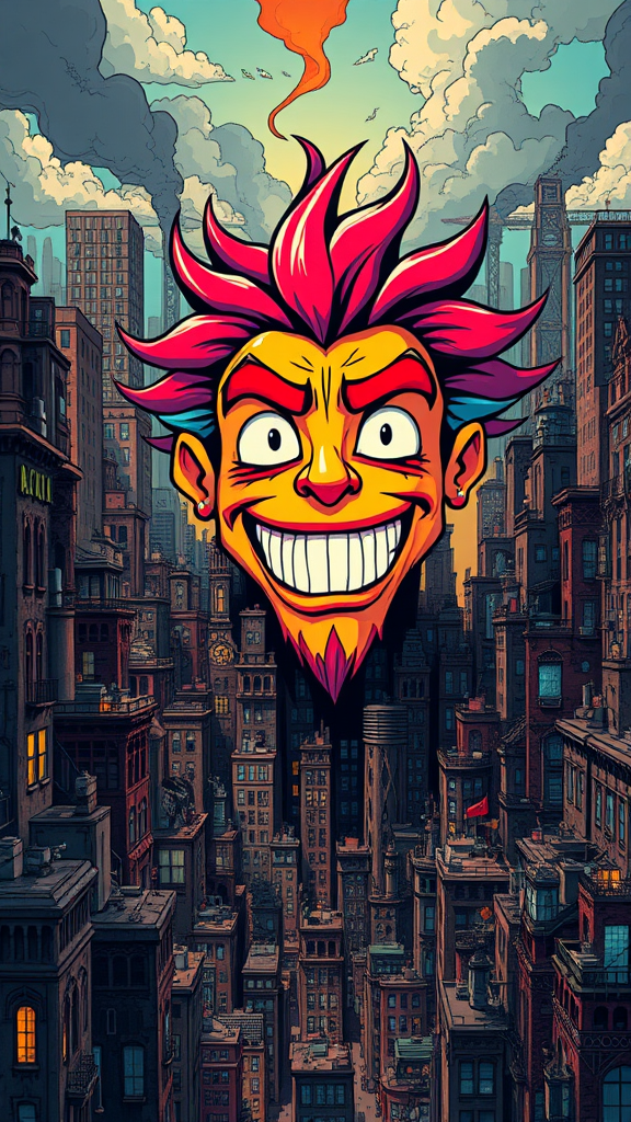 A vibrant cartoon face bursting with vivid colors rises from an intricate cityscape, bearing the stylistic essence of Tim Doyle. The city is composed of industrial forms, each corner packed with hidden details and darkly nuanced textures. The piece exhibits a solarizing mastery reminiscent of Agustín Fernández, creating a dynamic tension between light and shadow. The overall composition resembles a piece of striking poster art, where every detail coalesces to form an expressive and immersive experience that captivates the viewer.