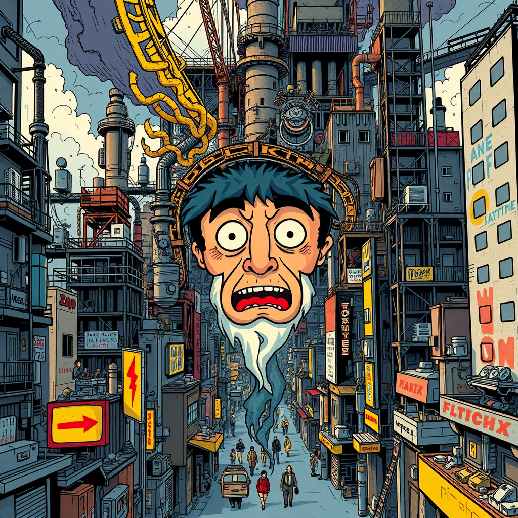 A vibrant cartoon face emerges from the heart of a bustling city, drawn in a style reminiscent of Tim Doyle. It features an intricate tapestry of industrial forms and urban life, teeming with hidden details. The artwork is intricately detailed, with a dark yet dynamic palette, evoking the brilliance of a solarizing master. Influenced by Agustín Fernández, this piece combines poster art aesthetics with surreal, architectural fantasy, offering an expansive view at a unique 36:55 aspect ratio, with a stylized touch that breathes life into the scene.