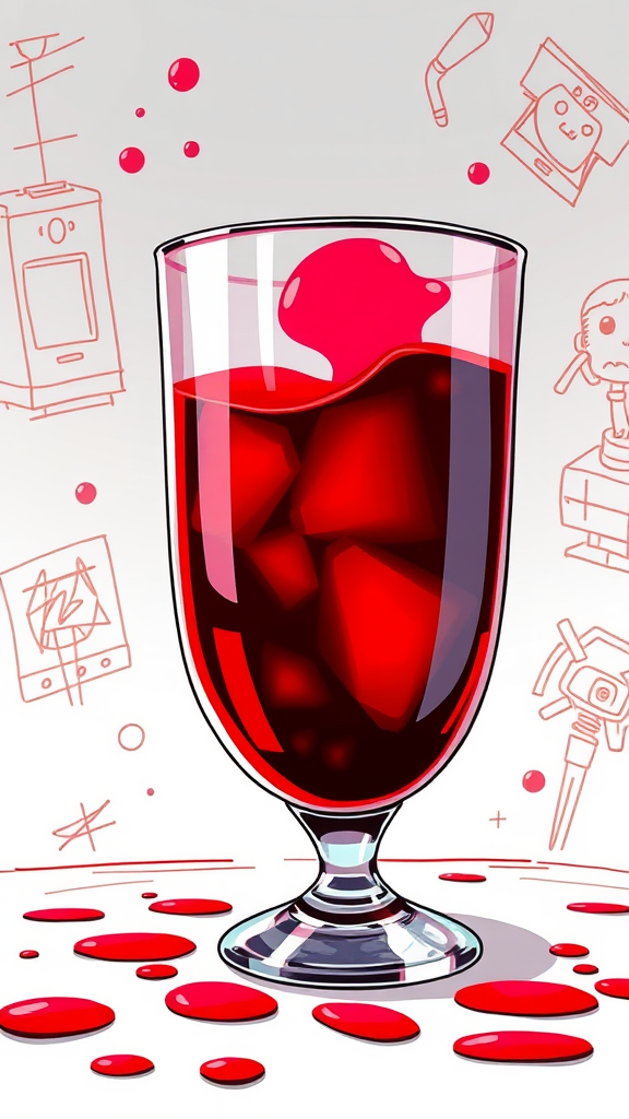 a vibrant cartoon-style depiction of a glass filled with dark red liquid, reminiscent of blood, in a 3D, anime-inspired style, surrounded by quick, expressive sketches in the background, highlighting the glass in low resolution, maintaining a normal quality to enhance the surreal yet playful atmosphere