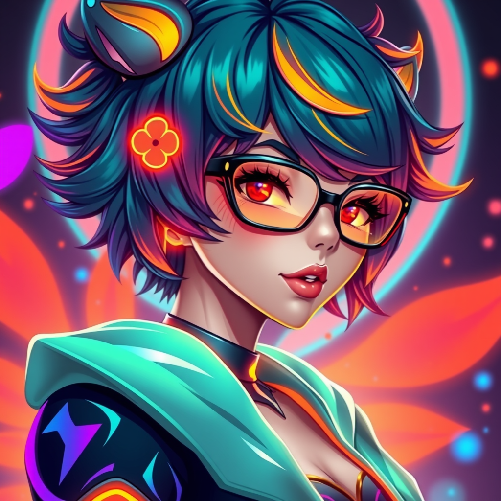 A vibrant character with glowing orange hair accents, wearing sleek glasses, embodying a futuristic digital art style. Infused with a flowerpunk essence, her attire blends shiny and glossy textures in a palette dominated by dark teal and bright orange hues. She radiates charm, surrounded by lively, pulsating colors that reflect her dynamic energy and captivating presence.