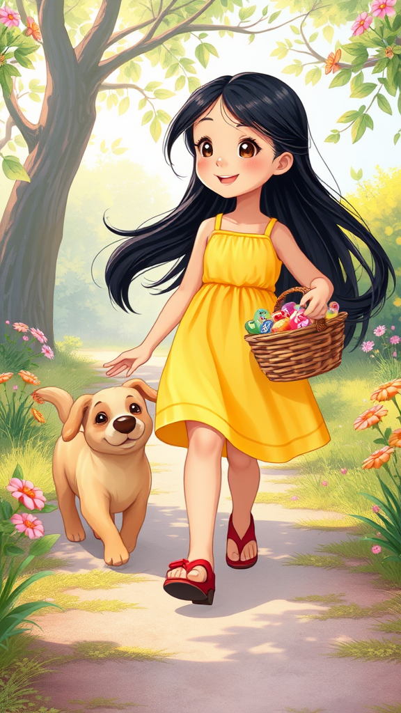A vibrant children's book illustration features a young girl with long, flowing black hair, adorned in a cheerful yellow sundress and playful red sandals. She joyfully strolls through a whimsical park, her lively pet dog, with soft, golden-brown fur, trotting beside her. The girl clutches a delightful basket filled with colorful candies, the treats peeking out with tempting hues. The scene is awash in soothing pastel colors, adding a dreamy and magical quality to the illustration. The setting is a sunlit path, lined with lush greenery and dotted with enchanting wildflowers.