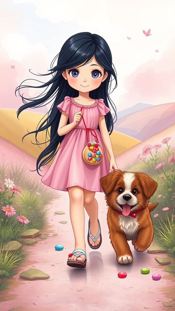 A vibrant children's book scene depicts a young girl with flowing black hair clad in a soft pink dress and sparkly sandals, as she strolls down a whimsical path. Her loyal companion, a sprightly dog with fluffy brown fur, trots happily beside her, eyes twinkling with mischief. The girl clutches a small pouch overflowing with colorful candies, the sweet aroma dancing in the air. The backdrop is a dreamlike pastel landscape, with gentle hills and candy-colored flowers swaying in the breeze. A hint of magic shimmers in the air, as if a fairytale is unfolding with every step.
