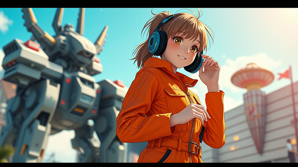 A vibrant cinematic movie poster featuring a young female DJ in a futuristic, detailed orange jumpsuit clutching her headphones. She stands confidently, surrounded by the pulse of music with an ancient mech towering in the sunny backdrop. The visuals are anime-inspired with manga graphics, glowing with bright colors and high detail. Offset printing techniques bring the poster to life in stunning 8K HD quality with a CMYK palette. The atmosphere is joyful, bathed in natural lighting, capturing the unique blend of futuristic and nostalgic elements.