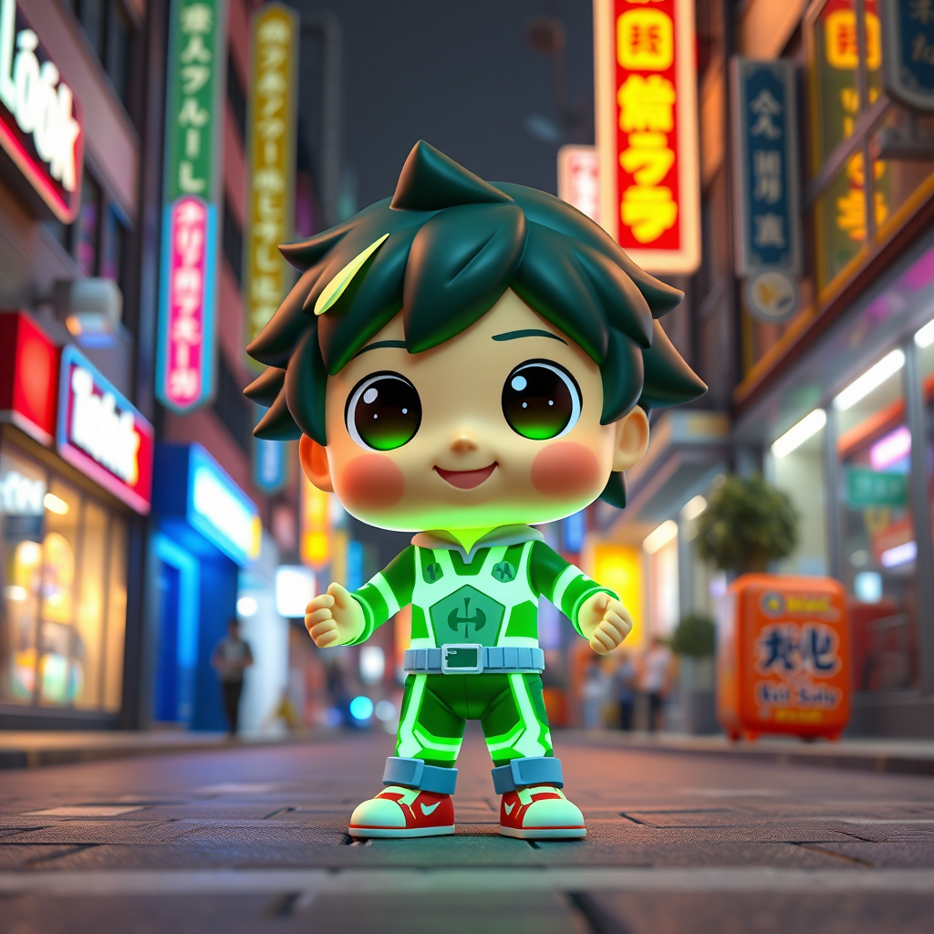 A vibrant city street featuring a super cute full body 3D image of Izuku Midoriya with captivating big eyes, exuding happiness and charm. Rendered in C4D, this chibi-style figure resembles a pop mart blind box toy, illuminated by bright street lighting. The setting includes a solid color backdrop that enhances the fluorescent translucency and luminous body of this kawaii doll. With intricate details akin to Pixar's finesse, the scene captures the essence of a Magic Space Warehouse, showcasing Izuku with closed hands and fists. The rendering is done using an OC renderer, ensuring high detail in 8K resolution with studio lighting. This petite SD character combines elements of loli and toddler charm, presenting a beautifully crafted piece without imperfections like deformed features or unnecessary artifacts. The character is center-focused, free from cropping issues, and displayed in a single clear view.
