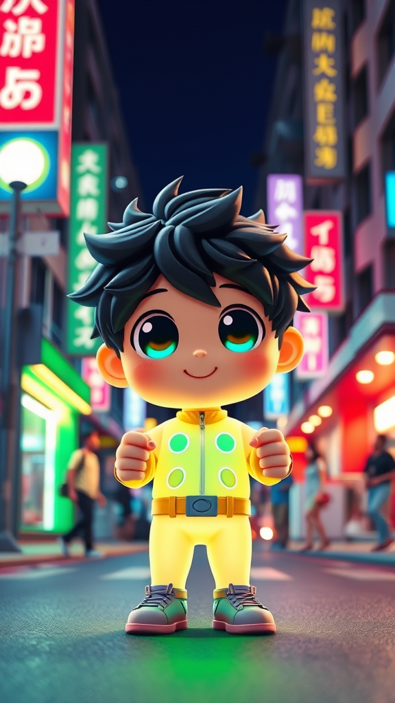 A vibrant city street scene featuring an endearing full-body 3D image of Izuku Midoriya with big, cheerful eyes, exuding cuteness and happiness. The setting is illuminated by bright street lights, reminiscent of a pop mart box with a solid color backdrop. The chibi-style figure is depicted with fluorescent translucency and a glowing body, embodying kawaii aesthetics akin to a toy or doll. The scene draws inspiration from Pixar's complex 3D rendering, with intricate details emphasized by studio lighting, and references mediums like C4D and OC renderer. The image captures a playful and petite figure with elements of toddler-like charm, rooted in SD character design principles. It's framed against a Magic Space Warehouse background, showcasing Midoriya with closed hands forming fists, surrounded by a whimsical aura. The representation is void of unintended visual distortions like deformed pupils or extra fingers, ensuring clarity and focus on the character's cute perspective and joyous expression.