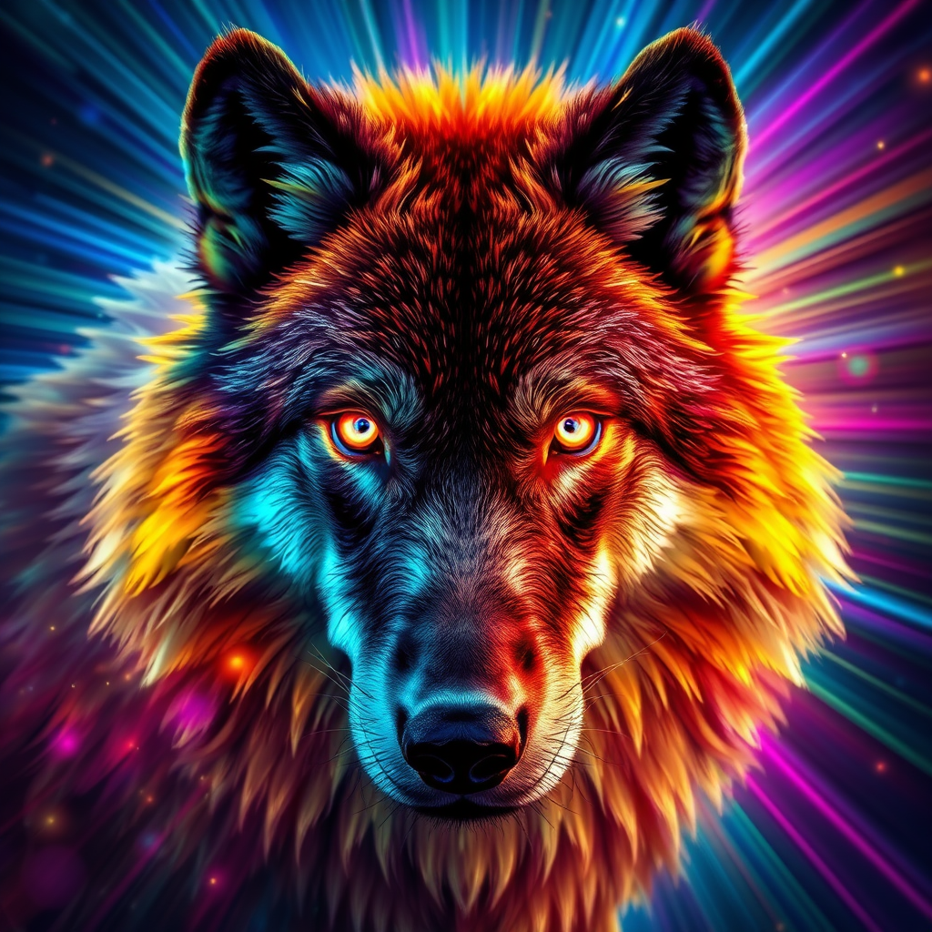 A vibrant close-up of a majestic wolf composed of neon rays, intricately detailed with ethereal fairy lighting, showcasing photorealism. The scene bursts with bright colors, casting volumetric light beams and an HDR glow. The wolf's eyes glimmer with an enigmatic intensity, creating an otherworldly contrast against the luminous backdrop, enhancing the mystique in a surreal atmosphere.
