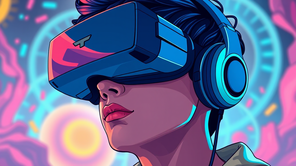A vibrant close-up of an individual immersed in a virtual reality experience, wearing a sleek VR headset and futuristic headphones. The scene is inspired by the style of Victor Mosquera, blending neo-dada aesthetics with vaporwave influences. The character is depicted in a hyperrealistic yet cartoonish manner, with bold, saturated colors and intricate vector art details, capturing the essence of a digital dreamscape. The background hints at a surreal, ethereal digital world filled with abstract shapes and soft neon glows.