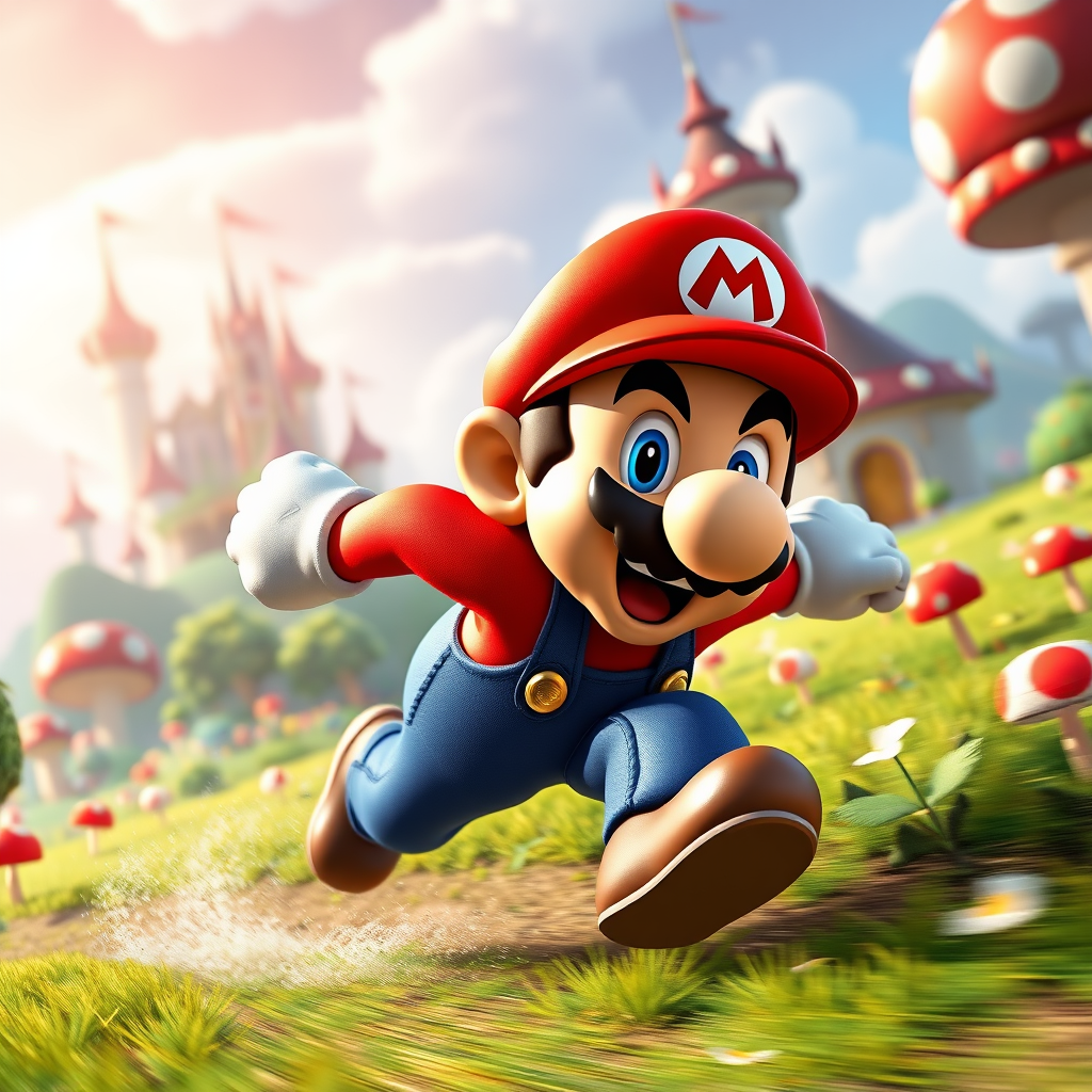 A vibrant close-up of Super-Mario sprinting with determination in the enchanting Mushroom Kingdom, the scene bursting with lush, colorful landscapes. The image is rendered in stunning 32k detail, capturing the essence of a trending 3D game, with intricate textures and dynamic lighting that highlight Mario's energetic motion. Set against a cinematic background with towering toadstools and charming castle silhouettes, the aspect ratio is 2:3, with a vivid sense of speed and excitement permeating the scene, softening the colors slightly for a whimsical, dreamlike quality.