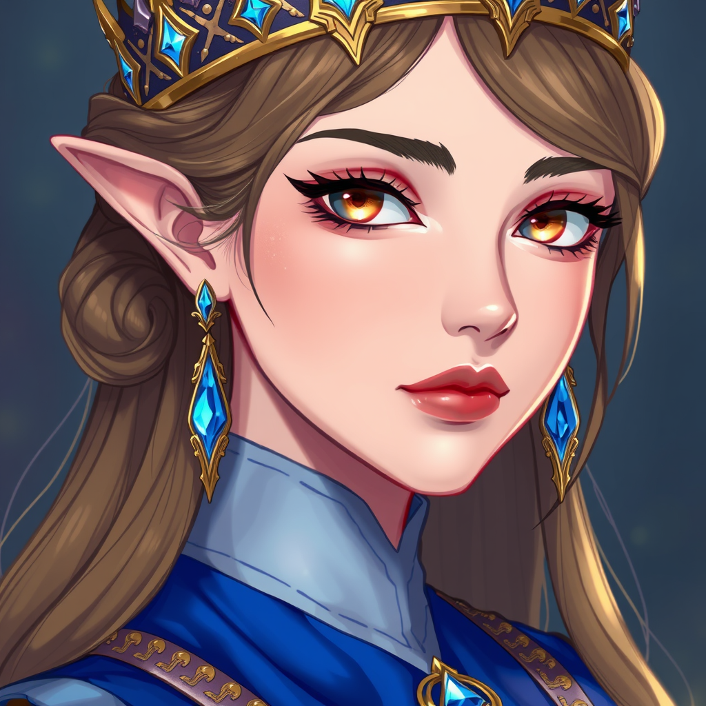 A vibrant close-up portrait of a regal woman adorned in an elegant sapphire blue dress, wearing a sparkling crown that catches the light, set in a digital anime art style. Her likeness is reminiscent of knights of the zodiac and captures the essence of fantasy royalty akin to princess Zelda, rendered with exquisite detail. The art features highly detailed and clean lines, showcasing the alluring intricacies of her character with depth and clarity. This fantasy anime illustration embodies the ethereal beauty and strength of an anime heroine, with a style similar to Breath of the Wild, blending intricate artistry with a touch of otherworldly charm.