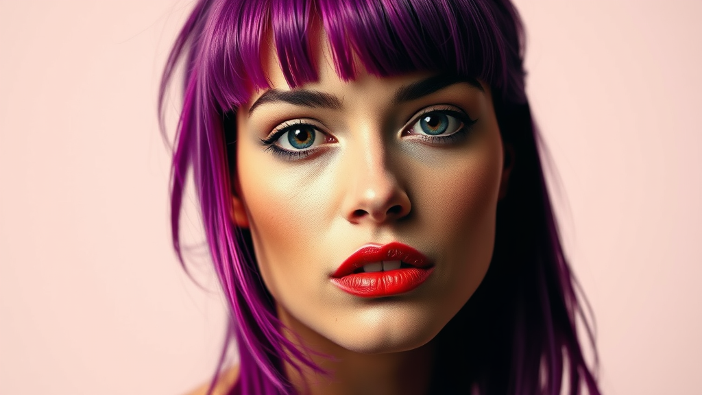 A vibrant close-up portrait of a woman with electric purple hair, blending the bold colors and graphic lines of Andy Warhol's pop art with the high-contrast, minimalist approach of Richard Avedon's photography. Her face is sharply detailed with a piercing gaze, set against a striking, contrasting backdrop, capturing the essence of contemporary pop culture. The portrait embodies an iconic and modern feel, with subtle creative elements highlighting the dynamic interplay between tradition and innovation in visual art.