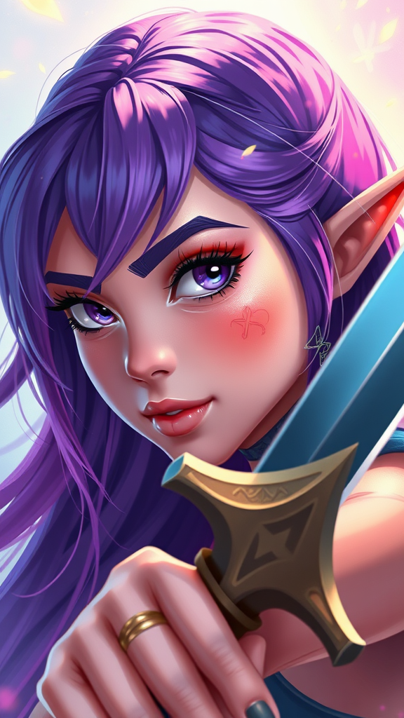 A vibrant close-up portrait of an elf girl with stunning purple hair, wielding a sleek sword. Her features are ethereal and captivating, exuding a sense of strength and grace. The artwork reflects inspirations from Rossdraws, featuring a blend of vibrant color palettes and dynamic lighting. Influences from WLOP and Artgerm are evident in the detailed rendering, capturing the character's essence. The style is a fusion of cartoon vibrancy with realistic digital painting techniques, resulting in a visually striking portrait that balances fantasy with a touch of modern elegance.