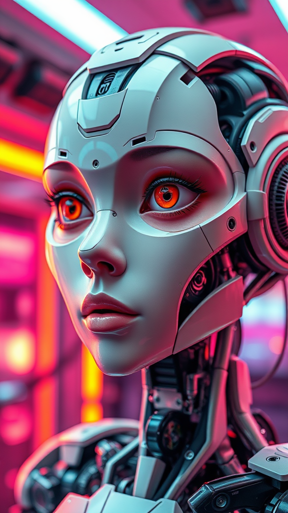 A vibrant close-up shot, capturing a cinematic portrait of an intricate robotic girl with a blend of android and humanoid features. Her face is remarkably detailed with robotic eyes, a finely crafted robotic nose, and a meticulously designed robotic mouth and lips. The futuristic theme is evident in the ultra-detailed room interior, filled with vibrant colors and high contrast. This masterpiece is crafted in professional, high-resolution quality, showcasing the detailed robotic body against the futuristic background. Her features balance between the mechanical and the human, featuring big eyes with realistic eyelashes, a human-like nose, and lips, all forming a feminine, humanoid face. Despite the complexity, the design avoids any deformities or errors, ensuring proportions are well-aligned with no extra limbs or features, creating a seamless blend of technology and human aesthetics in a digital illustration.