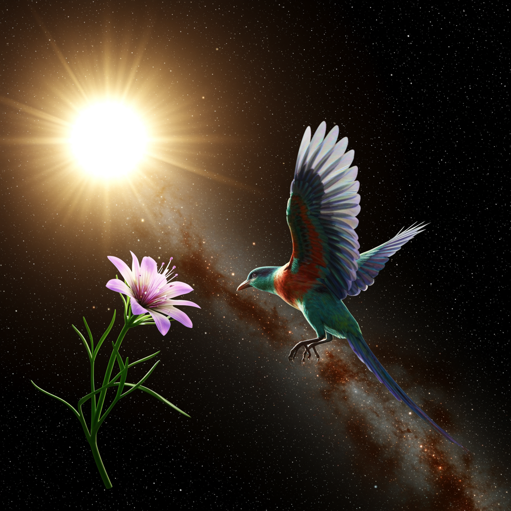 A vibrant colibri hovers in the vastness of space, its iridescent feathers reflecting the light of distant stars. Nearby, a delicate celestial flower unfurls its petals, basking in the warmth of a brilliant sun. This harmonious scene captures the essence of nature's beauty intertwined with the cosmos, all rendered in stunning 4k detail.