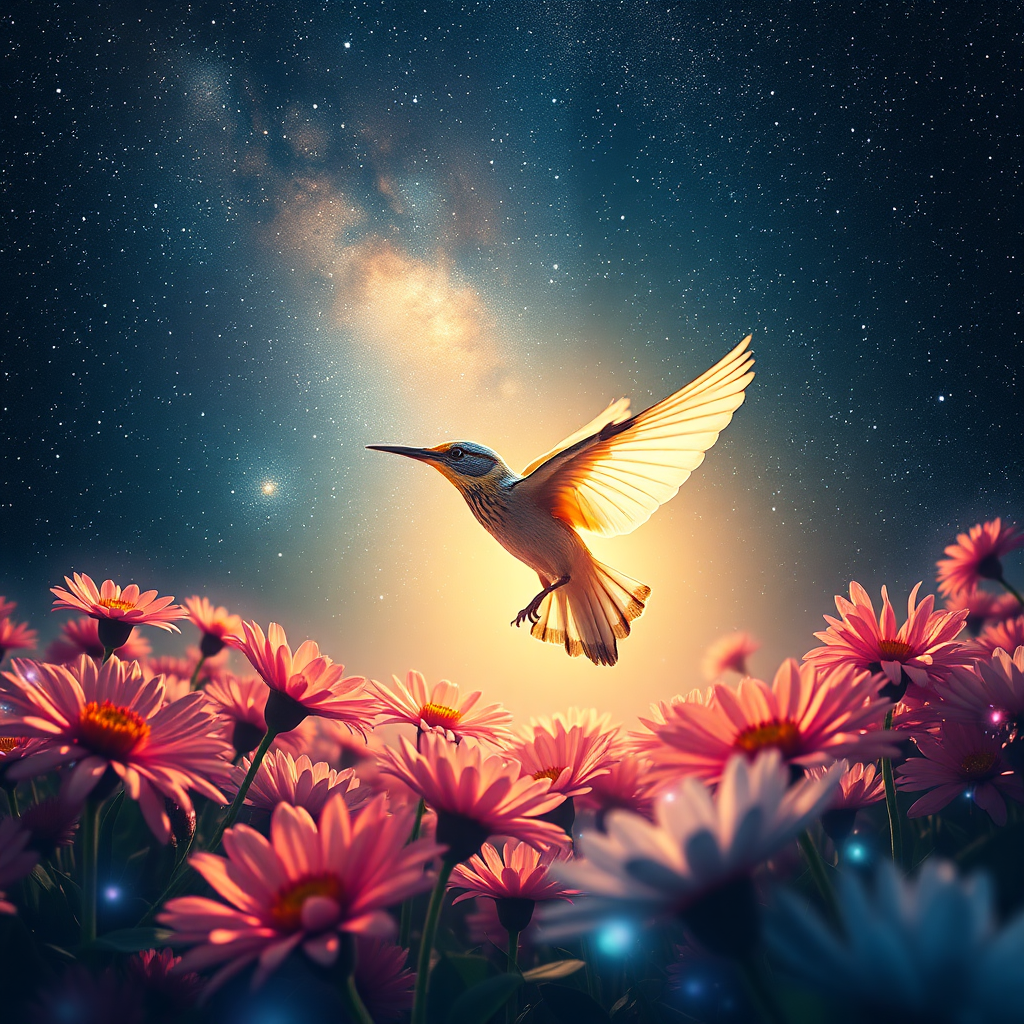 A vibrant colibrie flutters gracefully through the cosmos, its feathers shimmering under the ethereal glow of distant stars, amidst a celestial garden of galactic flowers radiating with luminous colors, as the radiant sun casts a golden halo illuminating the breathtaking tapestry of nature in stunning 4k detail.