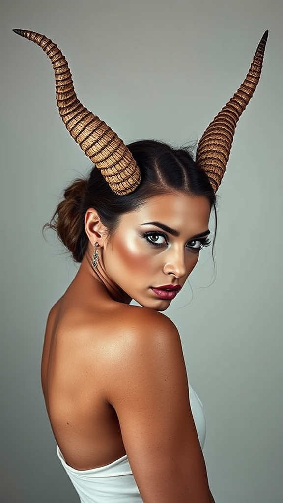 A vibrant color image depicting a woman elegantly posing, adorned with strikingly intricate and artistic horns crafted from unexpected materials, inspired by the innovative style of Brian Jungen. Her expression is both fierce and captivating, reminiscent of the dramatic flair seen in Steven Meisel's works. The composition maintains a portrait orientation with a slightly elongated aspect ratio, enhancing the graceful lines and posture of the subject. The setting is minimalist yet rich in texture, spotlighting the raw and avant-garde essence of the visual narrative. The lighting highlights the contours of her face and the detailed artistry of the horns, creating a dynamic interplay of shadows and light, and capturing a sense of bold creativity.